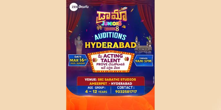 Grab this golden opportunity to shine on the big stage like never before with auditions of the popular show Drama Juniors season 8 will be held on Sunday, March 16th at Sarathi Studios, Ameerpet, Hyderabad from 9 am to 3 pm. For any further queries, please call 9032581717.