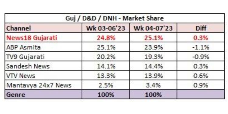 According to the latest BARC data (BARC; market share% 24 hrs, TG: All 15+, Guj/D&D/DNH, Wk 07’23, All days), News18 Gujarati has beaten ABP Asmita, TV9 Gujarati, Sandesh News, VTV News and Mantavya 24×7 News. ABP Asmita stood second at 23.9% market share, whereas the market share of TV9 Gujarati was at 19.3%. Sandesh News stood at 14.4%, VTV and Mantavya 24×7 News captured 13.9% and 3.4% market share respectively.
