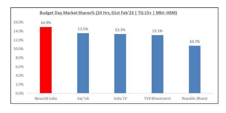 According to the latest BARC data, News18 India beat Aaj Tak, India TV, TV9 Bharatvarsh and Republic Bharat. The market share of Aaj Tak TV stood at 13.5%, whereas the market share of India TV was at 13.3%, TV9 Bharatvarsh stood at 13.1% and Republic Bharat captured 10.7% market share. (BARC; market share% 24 hrs, TG: 15+, HSM, Budget Day)