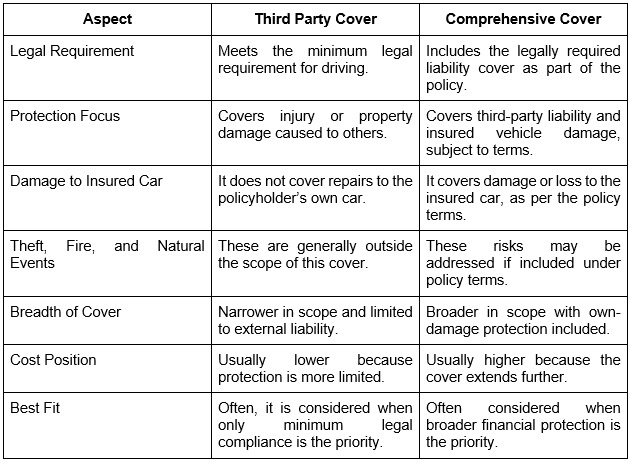 Both policies serve different purposes, even though they relate to the same vehicle. The difference becomes clearer when legal cover, vehicle damage, and protection are compared side by side.