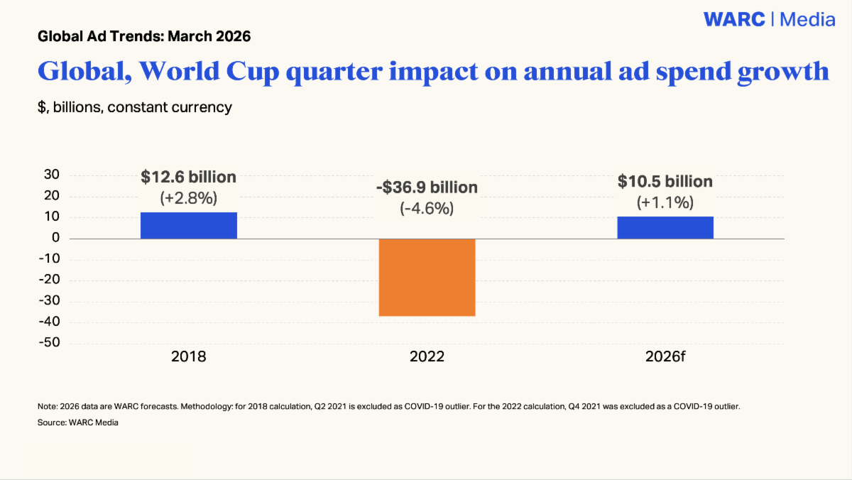 According to WARC, while the tournament is projected to generate a $10.5 billion uplift in ad spend during the event quarter, this represents a modest 1.1% incremental gain compared to the FIFA World Cup 2022. This is significantly lower than the $12.6 billion (+2.8%) boost seen during the FIFA World Cup 2018, indicating a declining marginal impact.