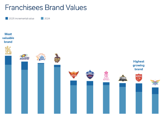 Punjab Kings (PBKS) stood out as the fastest-growing franchise, recording a staggering 39.6% year-on-year increase in brand value. Lucknow Super Giants also saw significant traction with a 34% rise.