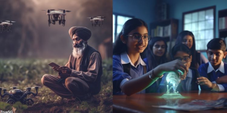 The first image shows an Indian farmer operating drones to examine crop health, followed by a picture of students learning through a holograph to bring their textbooks alive and doctors wearing VR headsets performing a remote surgery. While one of the images show an Indian family enjoying sports live where the center table turns into stadium projection.