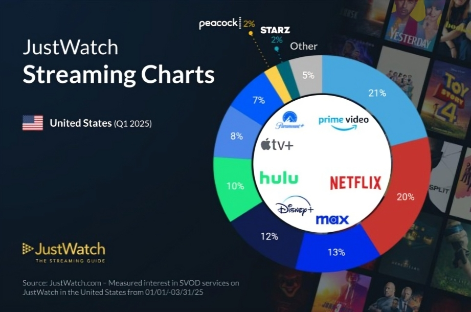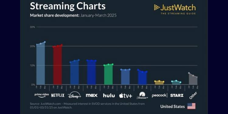 JustWatch has released its latest SVOD market share insights for Q1 2025, measuring user interest across major streaming platforms in the United States. This quarterly update reflects the behavior of over 17 million monthly users across JustWatch’s apps and website from January 1 to March 31, 2025.
