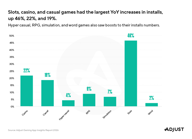 Among key findings, strategy games led session growth globally with a 57% year-on-year increase, followed by casual and hyper-casual genres at 37% and 31%, respectively. Install growth was strongest in slots (46%), casino (22%), and casual games (19%), with other categories such as RPG, simulation, and word games also registering gains.