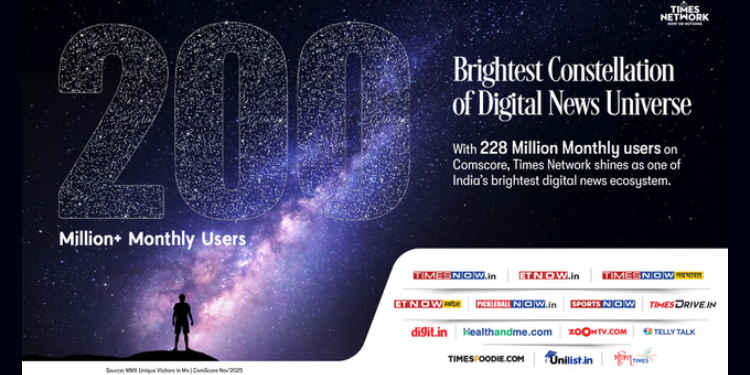 Mumbai: Times Network, India’s premium broadcast and digital network has achieved a landmark milestone in its digital growth journey, crossing 200 million monthly unique users across its digital platforms (Comscore MMX, November 2025). With over 228 million monthly unique visitors, Times Network has emerged as India’s #3 Digital News Publisher, underscoring its scale, and relevance with audiences nationwide by building platforms that truly resonate with today’s digital-first consumers.