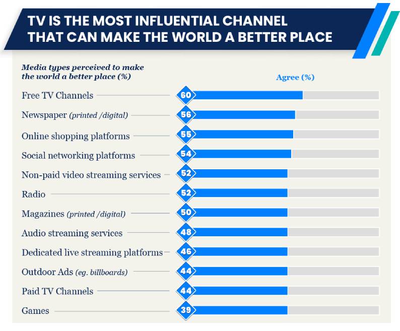 More than half of surveyed respondents (60%) agreed that free TV channels make the world a better place. TV remains a very important medium in influencing mindsets and shaping cultural behaviour.