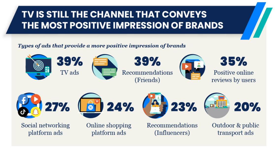 In APAC, ads played on TV is ranked #1 for conveying a positive impression of brands. In fact, TV ads (39%) received equal weightage alongside the recommendations of friends (39%). TV retains a unique strength in building brand equity.